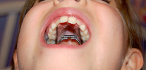 - As doenças endógenas transportadas por uma criança na primeira infância podem levar ao desenvolvimento de uma mordida distal. Por exemplo, o raquitismo causa alterações nas estruturas ósseas de todo o organismo, influenciando bastante o processo de seu desenvolvimento. Portanto, a mandíbula inferior em crianças submetidas ao raquitismo geralmente é reduzida em tamanho, em comparação com a norma. A imagem mostra a chamada mordida instável (aberta);